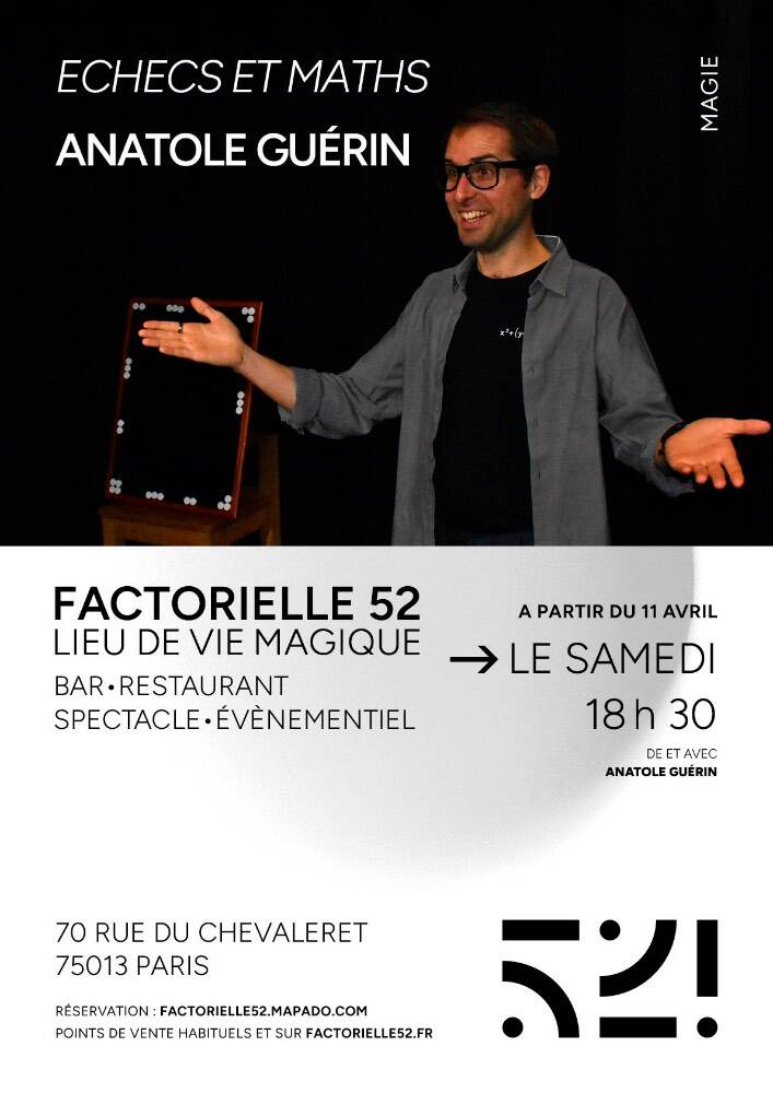 Bonjour à tous ! Nous sommes ravis d'accueillir le nouveau spectacle de Anatole Guérin au Factorielle 52 ! Ca se passe tous les samedis à 18h30, à partir du 11 avril. Le temps d’une soirée, Anatole relève le défi de vous bluffer, vous faire rire et rêver avec… les mathématiques ! Derrière les murs des collèges et des lycées, une équation reste sans solution : celle de l’échec en mathématiques. Pour percer ce mystère, notre journaliste d’investigation Anatole G. s’est infiltré au sein de l’éducation nationale sous le nom de M. Carrez, remplaçant urgentiste en mathématiques. Si cette matière lui est complètement étrangère, il espère tout de même s’en sortir avec quelques tours de magie en poche. Mais cela sera-t-il suffisant pour maintenir l’illusion ? Depuis plus de 10 ans, Anatole se produit sur scène et en close-up pour le plus grand plaisir de ses spectateurs. Ces deux terrains de jeux lui ont permis de développer une magie interactive et originale. Côté mathématiques, on vous laissera décider de son niveau d’expertise … professeur ou imposteur ? De 7 à 52!* ans. *52! = 52x51x50x….x2x1. Hate de vous y croiser 🙂 A bientôt, Mael -