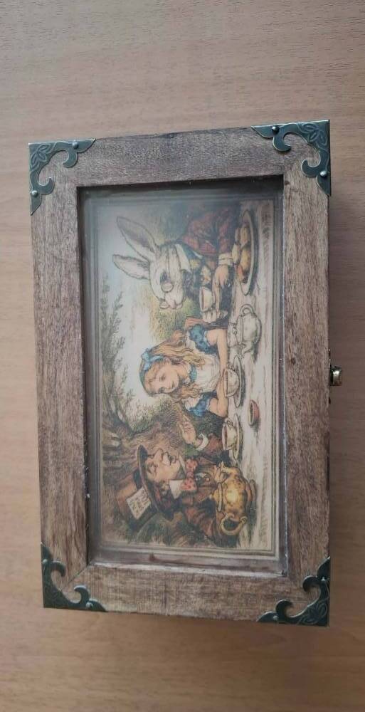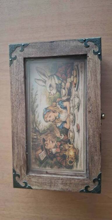 Je crée souvent des effets avec leur matériel. Se sont des capsules temporelles qui racontent une histoire et qui viennent prendre place dans mes sets et mes univers. Je vous présente Ici "Le Rêve d'Alice " (Acaan à la carte pensée). Je fais souvent l'inverse l'effet est crée après mon idée de thème, mais là tout est parti de MA fascination pour la fascination des magiciens cartomans pour l'ACAAN! Je n'ai jamais compris, même si je trouve l'effet sympa, pourquoi il était si prisé par rapport à d'autres? Mais je me suis quand même dit que j'aimerais avoir le mien. Comme mentaliste et illusionniste fantastique j'ai de suite voulu un effet de carte pensée et dans un univers onirique. L'évidence m'est apparue: le fameux roman de Lewis Carol. Ainsi est née cette capsule : Le Rêve d’Alice Dans le jardin étrange de la Reine de Cœur, là où les roses murmurent des secrets et où les gardes-cartes montent silencieusement la garde, un rêve commence. Un spectateur ferme un instant les yeux… et laisse naître dans son esprit une carte, puis un nombre, comme deux pensées égarées dans le vent. Une gorgée de potion… un sucre d’orge aux reflets merveilleux… et déjà le monde se trouble doucement, comme dans les songes d’Alice. Les cartes frémissent, le temps ralentit, et quelque part s’ouvre l’entrée d’un terrier mystérieux. Alors, guidé par la magie de ce rêve éveillé, le spectateur descend lui-même au fond du terrier… et là, comme si le destin l’y avait attendu depuis toujours, repose sa carte. À l’exacte place de son nombre. Un instant suspendu entre rêve et réalité… là où les songes d’Alice deviennent possibles. Toutes mes capsules ont un contenant ou je range tout. Souvent je chine, je répare, je recycle. Ici je suis parti d'une boite vierge de loisir créatif pour la transformer en boite à thé (normal pour Alice) ancienne. Patine, lustrage, ajout de coin, illustration ancienne d'origine d'une première version du livre, feutrine, décoration, ce qui donne Puis le matériel nécessaire, un cadre, un sucre d'orge magique, la fameuse potion et un jeu de cartes illustrations anciennes sur le thème: Le cout global environ 15 euros et un peu d'huile de coude. Je vous présenterez bien entendu la routine dans un prochain apéro magique!