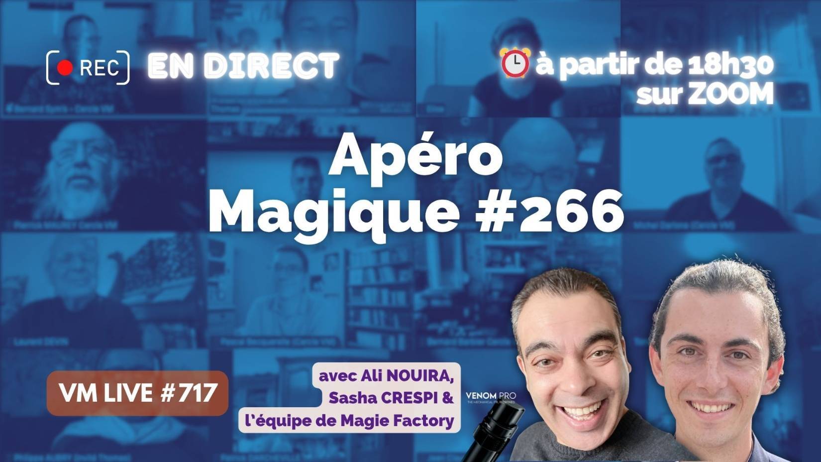 Cette édition promet d’être mémorable avec trois moments forts à ne manquer sous aucun prétexte : 🌟 @Sasha CRESPI : Les secrets de son passage à La France a un Incroyable Talent 2025 Pour la première fois, Sasha CRESPI nous ouvre les portes des coulisses de son aventure télévisuelle ! Il reviendra en détail sur son passage remarqué à La France a un Incroyable Talent 2025. Préparation, émotions, défis techniques, réactions du jury… Sasha nous raconte tout ! Une occasion unique d’découvrir l’envers du décor d’une des émissions les plus populaires de France. 🎪 @Ali NOUIRA présente les invités prestigieux du Congrès AMF Ali NOUIRA nous dévoilera en exclusivité la programmation du prochain Congrès de l’Association Magique Française. Quels artistes internationaux ? Quelles conférences ? Quels ateliers ? Ali nous guide à travers cette édition qui s’annonce exceptionnelle et nous présente les personnalités qui feront le voyage jusqu’en France. 🃏 @Benjamin VIANNEY & @Theotim MARTINS dévoilent Venom Pro Les créateurs Benjamin VIANNEY et Theotim MARTINS nous présenteront leur nouvelle création : Venom Pro. Découvrez en avant-première cet outil qui promet de révolutionner certaines routines de magie. Les concepteurs expliqueront la genèse du projet, ses possibilités et nous offriront quelques démonstrations exclusives. 📚 Et aussi au programme : Une exploration des Métamorphoses d’Etienne SAGLIO, un spectacle incontournable @Pierrick MAUREY : Un tour de cuisine étonnant avec un œuf qui va vous surprendre @Fabrice MARTIN : Apparition Royale, un effet visuel et élégant @Hedi METHAMEM : Le Gambler de @Julien LABIGNE Rejoignez-nous pour cet Apéro Magique #266 qui mêle actualité magique, créations originales et partage de connaissances ! 📅 Lundi 17 novembre à partir de 18h30 💻 En visioconférence sur Zoom ✅ En direct dès 18h30 sur Zoom Rejoins-nous ici : https://virtualmagie.com/vmlive Et pour les membres du Cercle VM, l’After à partir de 20h30 prolonge la soirée avec les explications et échanges en toute convivialité. Un lundi soir magique t’attend ! 💬 Tu veux participer ? 👉 Toutes les infos ici 👉 Découvre le Cercle VM et ses avantages (replays, Chambre des Secrets, After, etc.) ici : https://www.virtualmagie.com/boutique/cercle-vm/cercle Et comme toujours, l’Apéro Magique c’est aussi : 💬 de la convivialité, ✨ du partage, 🎩 et de la magie en direct, sans chichi ! 👉 Rejoins-nous dès 18h30 sur Zoom pour cette nouvelle édition ! L’After réservé aux membres du Cercle VM débutera vers 20h30, avec les explications détaillées des tours présentés. 💻 Connectez-vous librement et vivez un moment magique en toute convivialité. 🔒 Et en After à partir de 20h30, les explications pour les membres du Cercle VM 💡 Si cela te tente de découvrir l’After, tu es mon invité. Le truc : envoie-moi simplement un MP si tu es intéressé (ou email sur thomas@virtualmagie.com )