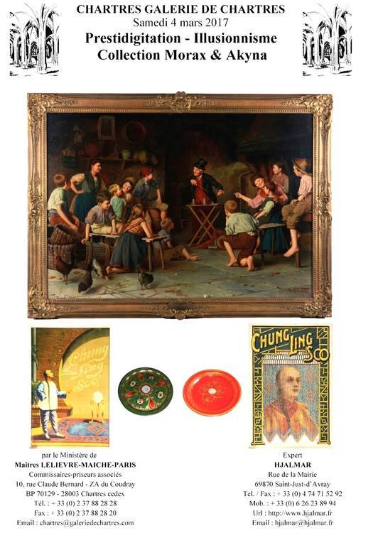 Vente aux enchères Magie Prestidigitation le samedi 4 mars 2017 à la Galerie de Chartres. Tous les lots proviennent de la collection de Didier Moreau alias « Morax » et de Christine Treiber alias « AKYNA » Didier Morax a collectionné pendant plus de 40 années. Sa passion l’a amené à devenir l’ami de Christian Fechner pendant plus de 30 années, et à s’occuper de sa collection privée les 12 dernières années de sa vie. Un catalogue spécial va être édité mais en attendant voici une liste rapide de ce que vous pourrez trouver lors e cette vente aux enchères. Vous pourrez acquérir des livres et Périodiques anciens sur la Prestidigitation et les Récréations Mathématiques et Physiques,des appareils Anciens de Physique Amusante et de Prestidigitation, en vernis Martin, laiton, laiton nickelé, métal chromé. Il y aura aussi des Jouets Mécaniques (Triksie Magician dog ; Fox the Magician ; Bunny the Magician ; Mr Fox the Magician with the magical disappearing rabbit ; Bobo the Magician ; Clown the Magician ; Petit Magicien. La plupart sont dans leur boite d’origine.) des affiches et posters de magiciens prestidigitateurs, des Documents divers sur l’Illusionnisme (Catalogues, Photos, Cartes postales, Ephemera & Memorabilia) En savoir plus sur http://www.virtualmagie.com/event/vente-de-magie-prestidigitation-28/#LIdxkMV7pKhzRfiA.991 point
