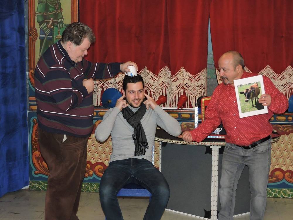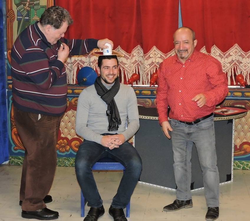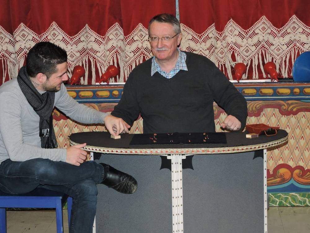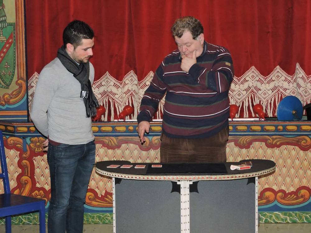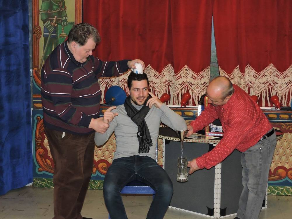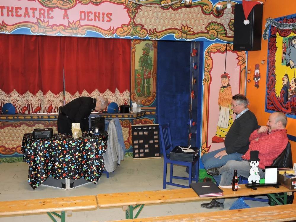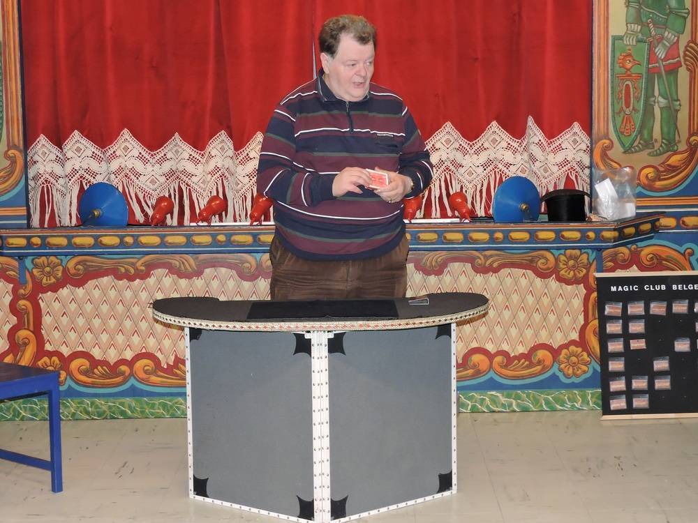 Joseph a reçu un joli cadeau à Noel et aimerait le tester. Notre dernier venu Julian est alors tout désigné pour venir faire le cobaye. Pour s’assurer de bien tout faire correctement, une fiche explicative est fournie. Tout d’abord, « verser du lait dans le Mug ». Ensuite « déposer une feuille sur celui-ci avant de retourner le tout sur la tête du spectateur ». Et oui mais tête en l’air, notre président a oublié de prendre une feuille avec lui, il décide alors d’utiliser la fiche explicative. Il suit les instructions jusqu’au moment où il s’aperçoit que … pour continuer le tour … ben il faudrait la suite des instructions, qui se trouvent sur la feuille sous le Mug. Même pas peur ! Il retire d’un coup sec la fiche explicative (vous auriez dû voir la tête de Julian !! ) et lit la suite des explications : « Ne surtout pas retirer la feuille qui est sous le Mug » … OUPS !!!! « Si vous avez malencontreusement retiré cette feuille, demandez au spectateur de rapidement boucher ses oreilles pour éviter les fuites éventuelles. » (On est alors tous heureux de ne plus être le « nouveau » :D) « Pour récupérer le lait il faut mettre un entonnoir sous le bras gauche et demander à un aide d’actionner le bras droit comme une pompe. » Se produit alors le miracle !! Le lait contenu dans le Mug passe par le cerveau (un bon nettoyage pour la nouvelle année ) , passe dans l’épaule, le bras et s’écoule via le coude en passant par l’entonnoir et tombe dans un grand verre. Oufff notre Julian est sauvé !!1 point