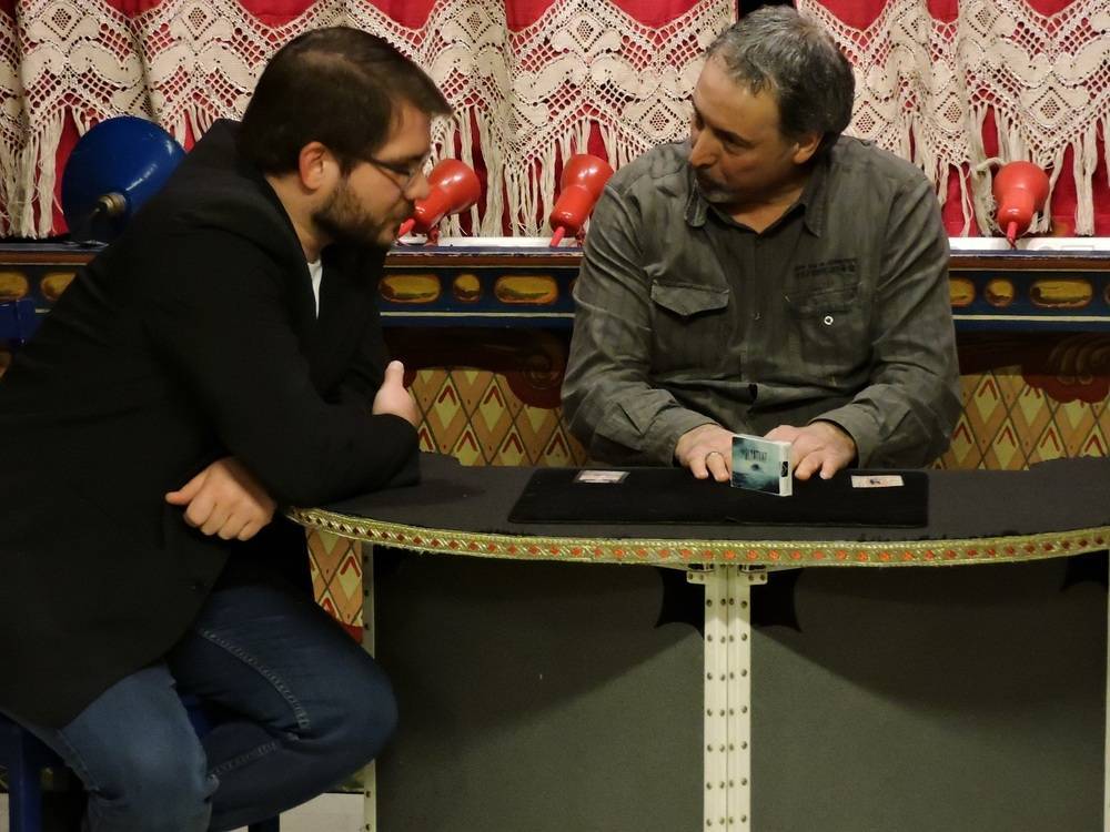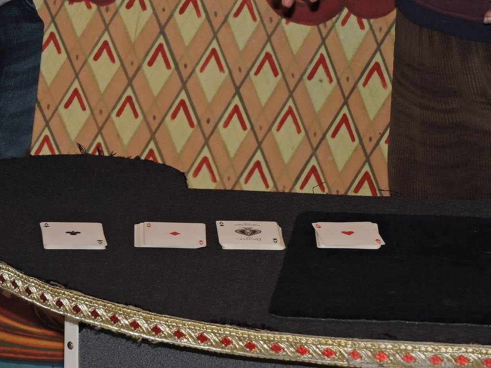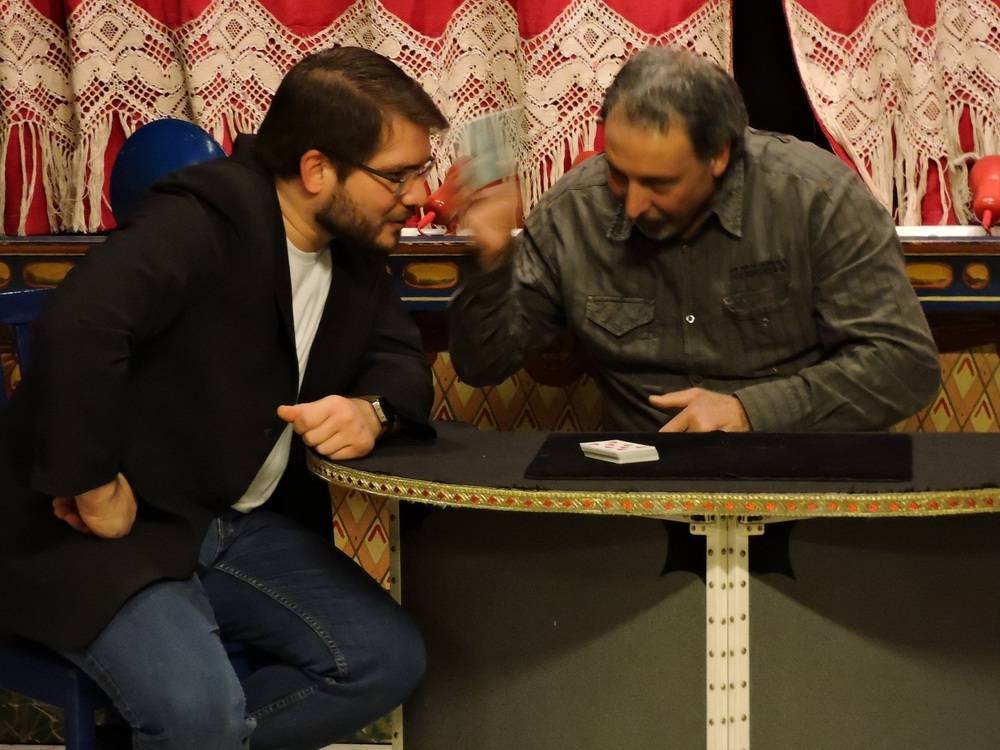 Francesco en a surpris plus d’un, en effet notre MacGyver s’installe avec un jeu de carte en main. Ça doit être la première fois que je le vois avec un jeu de carte, c’est vous dire ! « Guy ! J’ai besoin de toi, tu as une imagination débordante et c’est ce qu’il faut !! » Le boitier représente la prison d’Alcatraz et le jeu ses 52 prisonniers. Le spectateur choisi la carte qui le représentera. Deux cartes complices sont nécessaires pour organiser son évasion. Qui de mieux que Harry Houdini, le maitre de l’évasion et David Cooperfield, le maitre de l’illusion ? Une fois tous les prisonniers enfermé dans Alcatraz, Harry est placé sous le boitier, David sur celui-ci. Une passe magique. On vérifie alors dans les cellules, le prisonnier s’est échappé, il est retrouvé entre Harry Houdini et David Cooperfield !!1 point