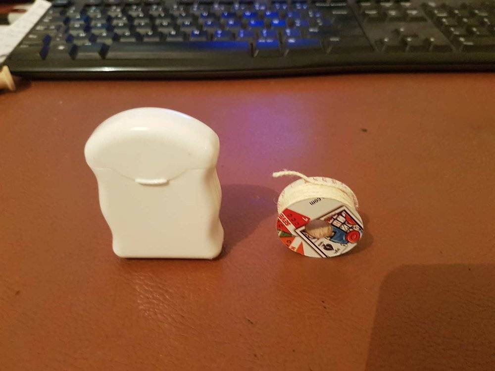 Mon distributeur de fil flash...... je suis parti d'un distributeur de fil dentaire de ce type.... On le vide de son contenu.... On fabrique un dévidoir, je suis parti d'une bobine en bois... On lui colle 2 joues de maintien (découpé dans une carte bicycle)... On met le tout en place... Votre distributeur est prêt... Idéal pour toujours avoir sous la main un fil flash pour diverses apparitions7 points
