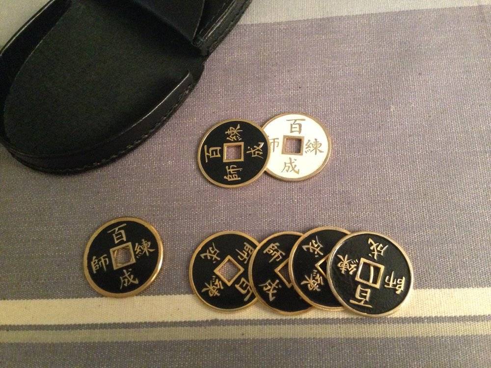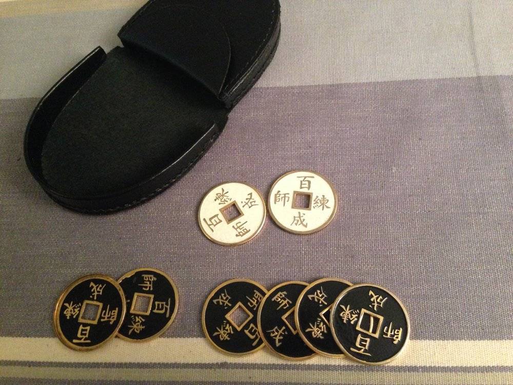 Voici un set de pièces chinoises peintes en noir. Une pièce est blanche. Une pièce est blanche d'un côté et noire de l'autre. La coquille a un sticker à l'intérieur qui permet de flasher l'intérieur. Dimension 35 mm, trou de section 7 mm permettant Chinese Charming Challenge. Le tout vendu 60€ (porte monnaie 'sabot' sur la photo offert).1 point