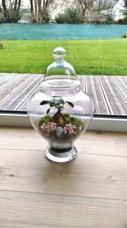 Afin de faire une petite expérience avec mes enfants, nous avons crée un terrarium fermé, sorte de petit écosystème. L'idée est de voir la plante "vivre" avec simplement 1 ou 2 arrosage par an. Par moment, il y a de la condensation qui recouvre peu à peu les parois et apporte l’humidité nécessaire à la vie des plantes. On verra si dans le temps, ça dur Si vous avez ça chez vous, ou déjà fais cette expérience, je suis preneur de vos retours. Amitiés SoCa1 point
