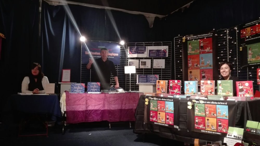 Merci Gunmm pour ce commentaire élogieux , c'est très sympa et ça fait vraiment plaisir. Bien que le livre s'adresse à toutes les tranches d'âges (à condition d’être capable de lire), j'ai effectivement encore vu durant ces trois derniers jours plein d'enfants complètement fascinés par l'ouvrage (oui, ils ouvrent de grands yeux en voyant la transformation "magique"), quant aux adultes c'est l'expression "C'est génial !" qui revient le plus souvent. Bravo Julien ! *** Ci-dessous quelques photos-souvenirs de ce week-end, on peut y voir à gauche une nouvelle amie, Dominique Pernoo, auteure d'un recueil de nouvelles intitulé Noisy l'exil, ainsi que, sur le stand de droite (pas politiquement hein !), Caro et Zaf (oui, mon pote Zaf Zapha qu'on connaît bien en tant que bassiste du groupe Sergent Garcia et qui a joué avec de nombreux musiciens, de Yannick Noah à Jacques Higelin). Ci-dessous je mets des liens qui pointent vers sa maison d’édition de livres musicaux, LaCaZa musique, et vers son association Tout s'métisse. L'un des livres-CD, YEMAYA, voyage musical en Amérique Latine, est particulier pour moi car ma fille Paloma y a participé pour chanter le morceau phare du CD et qu'elle a pu ensuite l'interpréter seule sur la grande scène du théâtre des Bergeries alors qu'elle était toute petite , c'était touchant). https://lacazamusique.wordpress.com/ https://tsmlesite.fr/fr/ Des spots dirigés dans les yeux du public, c'est mieux.1 point