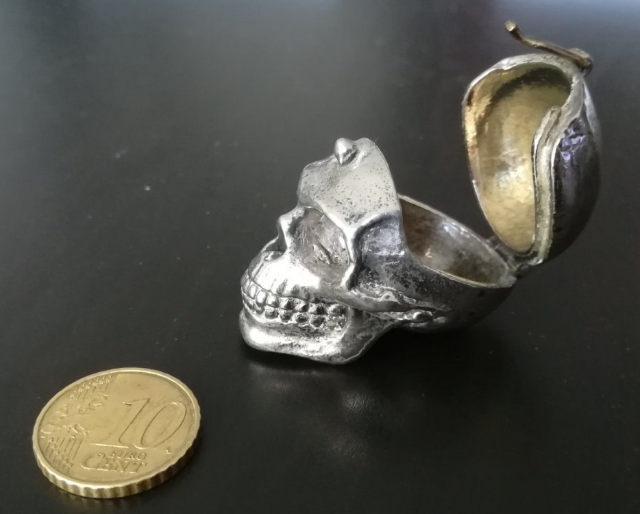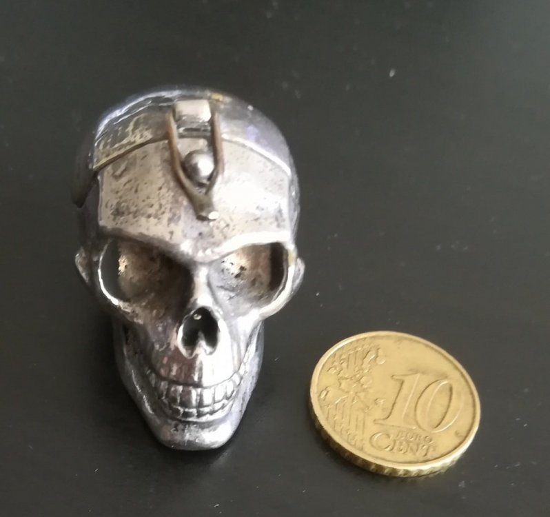 Bon… Ce n’est pas à proprement parler un objet magique mais je suis sûr que cette petite curiosité peut intéresser quelqu’un par ci. Ce crâne en métal est en fait une boite qui s’ouvre pour y déposer un trésor ou… un secret ! Très jolie petite pièce insolite et de curiosité. Je l’ai depuis une quinzaine d’années et je n’en ai jamais vu d’autre. Origine inconnue (memento mori ? objet maçonnique ?…). Je l’ai souvent utilisé en magie bizarre pour mettre une prédiction. 40 euros avec les frais de port inclus1 point
