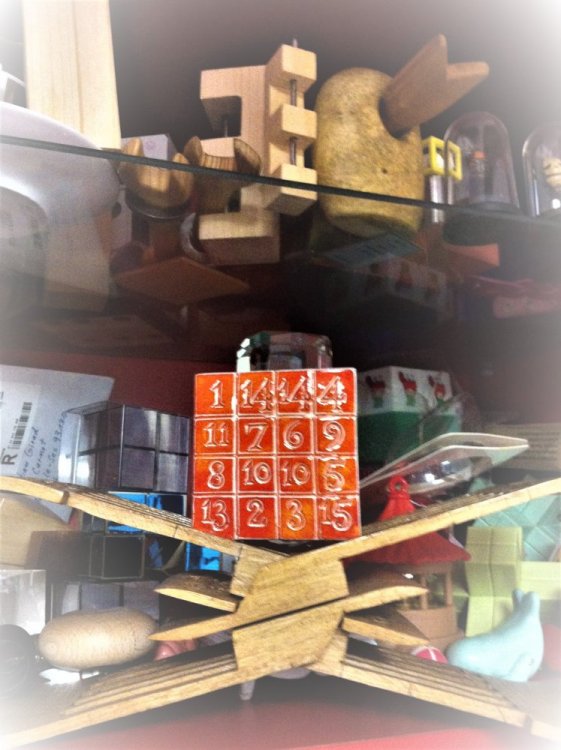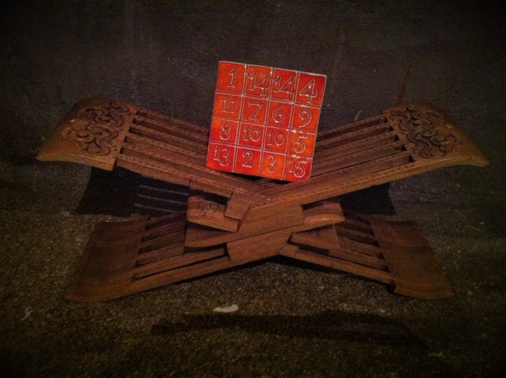 3. La mienne n'est pas truquée (juste trompeuse), voici le fameux carré magique acheté sur place à la Sagrada Família, en lévitation : J'ai justement parlé aujourd'hui-même (c'est fou ) du lutrin sur lequel il repose, dans ce message : Une vue sur une étagère d'objets insolites (ou impossibles) :