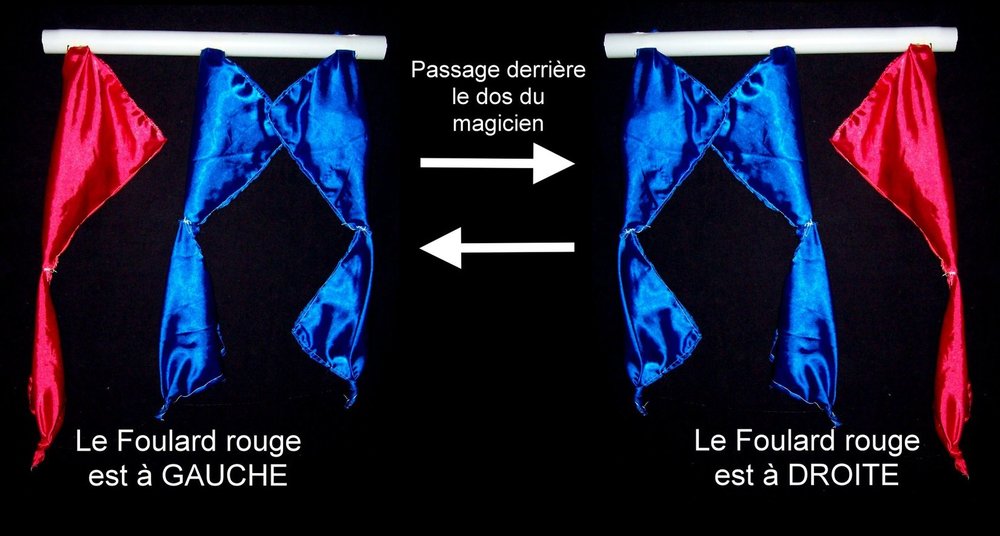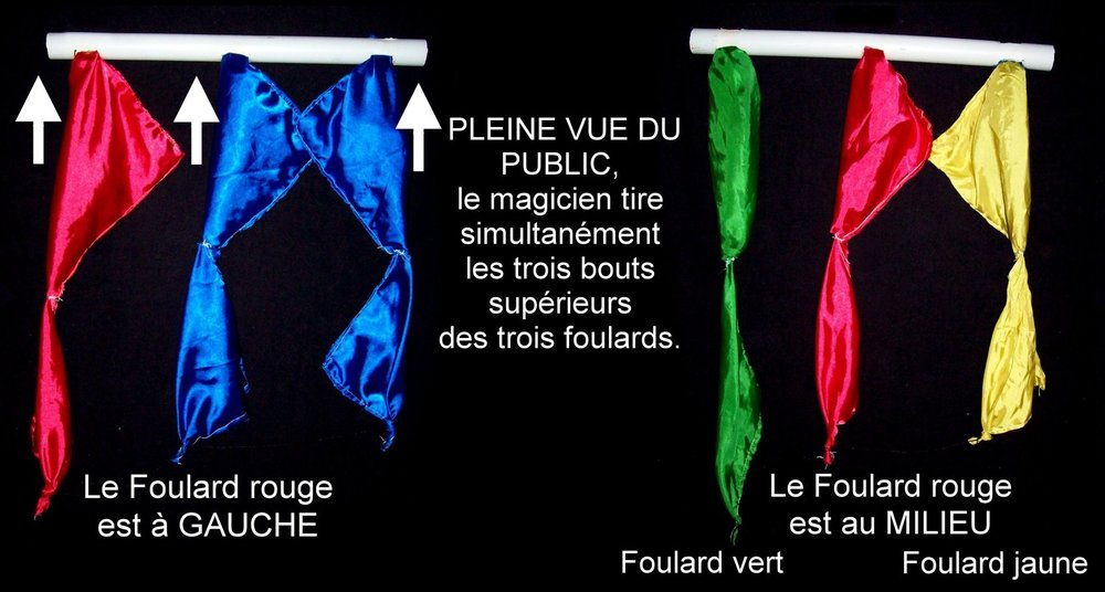 En préparant un spectacle de magie pour enfants, je me suis plongé dans mon armoire grenier avec les vieux tours de magie. Dans un but de créer des routines captant les petits bambins, je me suis intéressé au matériel de magie coloré. Je suis tombé sur le tour des deux foulards attachés, qui changent instantanément de couleur rien qu’on les passant de haut en bas dans le poing de la main. Cette redécouverte m’a inspiré pour en faire des routines avec ce vieux principe « magique ». J’ai sorti alors quelques morceaux de tissus colorés, ma machine coudre et je me suis mis à coudre des foulards avec des couleurs adaptées à deux routines imaginées : 1) La baguette aux trois foulards. 2) Boules et foulards aux couleurs inséparables. La baguette aux trois foulards : Inspiré, de la routine décrite par le magicien Jean Merlin « La réglette aux trois cordes », j’ai imaginé un tour similaire avec des foulards et avec en plus des transformations colorées de ces derniers. Effet : Le magicien, montre une grande baguette sur laquelle sont accrochés trois foulards : à gauche des foulards rouges, au milieu et à droite des foulards bleus. Dans un jeu théâtral avec le public, le magicien passe derrière le dos la baguette à deux ou trois reprises. A chaque passage camouflé, le foulard rouge qui était à gauche, devient à droites par rapport aux deux autres foulards bleus et vice versa. Le public pense avoir compris le truc, et croit que le magicien retourne simplement la baguette derrière son dos. Ce qui est en réalité, pas faux. Le magicien dans une ultime action et en PLEINE VUE DU PUBLIC, tire simultanément les trois bouts supérieurs des trois foulards. Deux chutes se réalisent sous les yeux des spectateurs : - Le foulard rouge prend la position centrale par rapport aux deux autres. - Les foulards bleus changent instantanément de couleurs l’un de vient de couleur jaune, et l’autre devient vert. Boules et foulards aux couleurs inséparables. Le magicien, présente deux petites boites vides. Dans la première il met une boule rouge et dans la seconde une boule bleue. Puis avec la boule rouge, il rajoute deux foulards rouges attachés, et avec la boule bleue deux foulards bleus attachés. Effet 1 : après claquements des doigts, les foulards changent de boite ; les foulards rouges deviennent bleus et les bleus deviennent rouges. Effet 2 : Les deux boules aussi se sont transposées, les couleurs sont inséparables, elles ont suivi les foulards de la même couleur.2 points