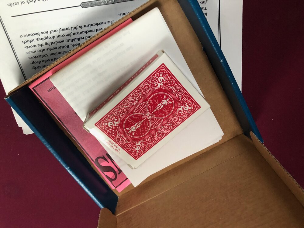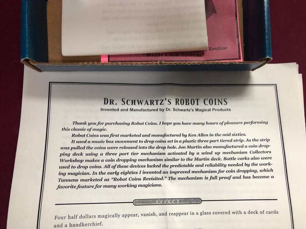 Vendu et acheté chez Tannen's à New York il y a 10 ans . Je ne suis pas sure qu'il en produise encore ......Mécanisme très intelligent automatique et mécanique sans électronique pour faire disparaitre 4 demi dollars à travers un jeu de carte bicycle pour les faire tomber régulièrement dans un verre . (Verre non fourni) Ce génial inventeur est un dentiste à la base .... pour l'anecdote. 125 dollars en boutique vendu 70 euros fdpi1 point