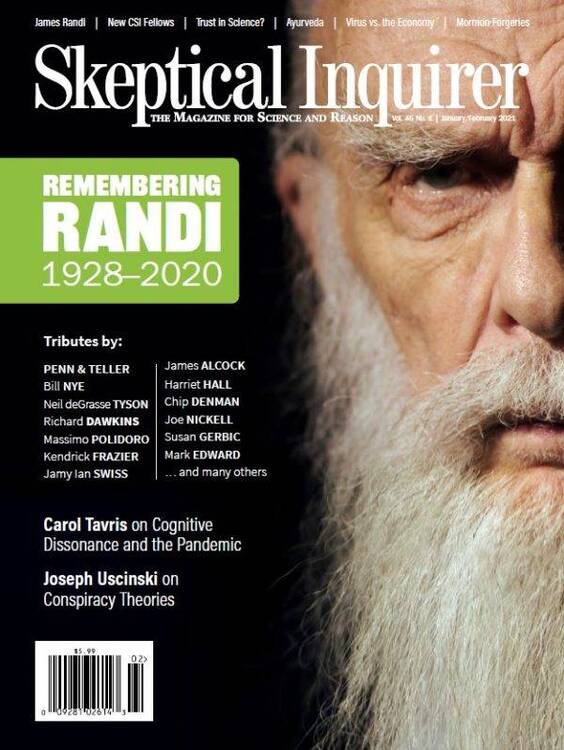 Skeptical Inquirer, The Magazine for Science and Reason. C'est une revue bimestrielle américaine publiée (depuis 1976) par le Committee for Skeptical Inquiry (CSI), organisation américaine qui se consacre à la critique des phénomènes "paranormaux", ou de disciplines qu'il juge pseudo-scientifiques comme l'ufologie, la parapsychologie, la cryptozoologie ou encore l'homéopathie. Il s'agit d'une des organisations les plus importantes du mouvement sceptique contemporain, avec The Skeptics Society. L'abonnement à la revue est de $16.99, soit 14€ par an pour 6 numéros. Cet abonnement vous donne accès à tous les futurs numéros, sous format digital (pdf). Mais également un accès aux archives complètes de la revue. Chaque revue, depuis le numéro 1, étant également disponible en téléchargement au format pdf. Et dans toutes les archives, de très nombreux articles sont en lecture libre. A noter également qu'avec une inscription gratuite sur le site, vous avez accès toutes les deux semaines à des présentations en ligne sur divers sujets. Ces présentations sont ensuite visibles sur la chaîne YouTube du Center for Inquiry (cfi). Viral BS: Medical Myths and Why We Fall For Them The Role of Cognitive Dissonance in the Pandemic Combating Fortunetelling Fraud (aka Psychic Fraud)1 point