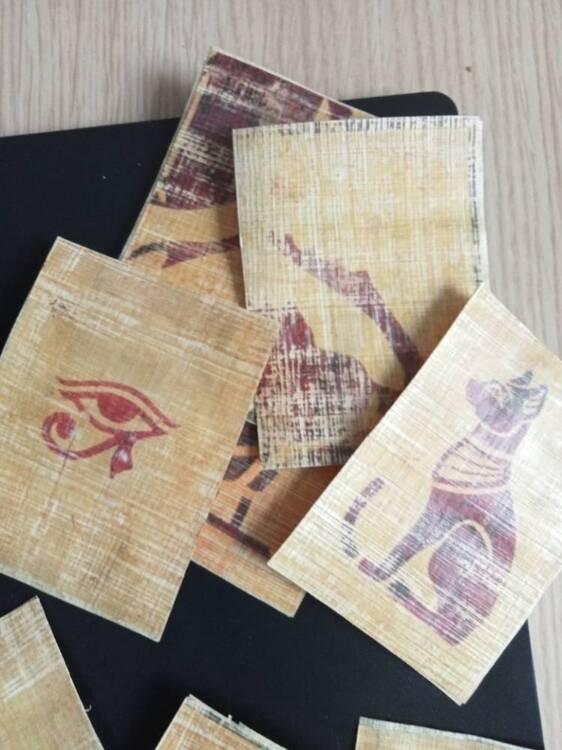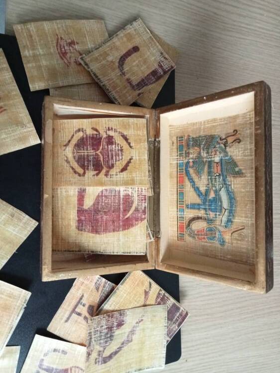 N'ayant pas le talent de graphiste de Gilles, j'ai repris les dessins initiaux. J'ai pu testé du papyrus 125mgr. Impression laser. Cela passe bien, les feuilles n'étant pas du A4 il faut juste les redécouper. J'ai fais deux impressions (recto et verso) et j'ai collé les deux, pour obtenir un papyrus (2 fois 125g) plus rigide pour aider les manipulations. J'ai ensuite gratté l'encre pour donner un effet ancien vieillis. Pour fixer l'encre un peu de vernis mat en bombe. J'ai récupéré une vieille boite en bois, avec un décor type croisade, égypte, que j'ai customisé à l'intérieur avec une impression encore sur papyrus avec un dessin antique. Me reste parce que je suis perfectionniste a remplacer la charnière et ses vis pas très historique... Les papyrus seront lié par une ficelle type paille. Je vais essayer de faire une petite vidéo de ma routine complète, un peu (beaucoup) différente de l'originale. Pour le coup au touché et à l'aspect on a un papyrus toilé. Vraiment intéressant pour d'autres projets.1 point