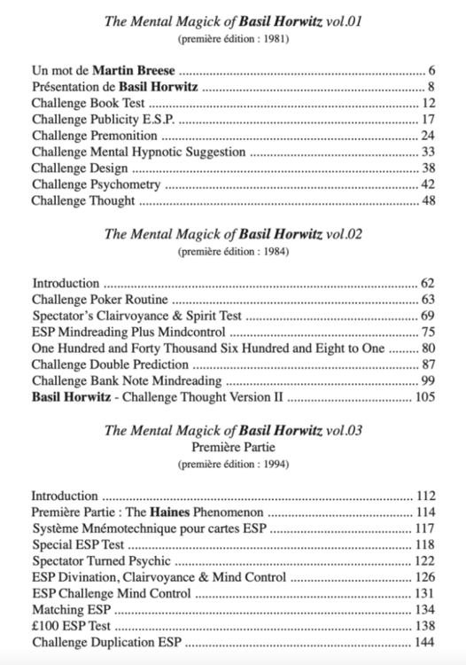 Basil Horwitz Tome 01 en Français état neuf 50 euros fdpi Enfin en français : Un recueil des publications du mentaliste Basil Horwitz ! Qu’ont Luke Jermay, Andy Nyman, Marc Paul en commun ? Basil Horwitz. Basil Horwitz a influencé (et continue d’influencer) leur mentalisme et celui de tant d’autres, et ce depuis des décennies !… En 1978, les Magicassettes sortaient, en anglais, dans lesquelles il décrivait à l’oral ses meilleures routines… Devant le succès de ces dernières suivirent les 5 volumes de The Mental Magick of Basil Horwitz (une retranscription sous forme de livres des cassettes). C’est avec fierté qu’aujourd’hui ces livres fondationnels sont mis à votre disposition en français, sous la forme de deux tomes ! Dans le respect des éditions d’origine, j’ai décidé de conserver les illustrations originales et de les sous-titrer. J’espère que vous prendrez autant de plaisir à déguster la “magie mentale” de Basil Horwitz que j’en ai eu lors de l’élaboration de ce projet. Sommaire :1 point