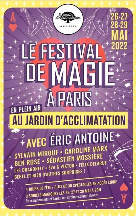 Le Jardin d'acclimatation accueille le Festival de magie en plein air pour 4 jours de fête exceptionnels ! Les 26, 27, 28 et 29 mai 2022, des artistes font rêver petits et grands avec leurs tours et leurs blagues : Éric Antoine, Sylvain Mirouf, Caroline Marx, Ben Rose, Sébastien Mossière, les Dragonfly, Éva & Viktor, Félix Delarue, Bébel et bien d'autres surprises. Plus de 30 spectacles sont au programme : spectacle de grandes illusions, spectacle de télépathie, show de magie comique, spectacle de mentalisme, one-man show magique... Trois soirées magiques ont lieu les 26, 27 et 28 mai à 20h au Théâtre Rouge. Quant au grand spectacle d'Eric Antoine and Friends, il s'agit d'un grand show avec illusions et magie ! Pour les enfants, un spectacle jeune public les attend tous les jours à 15h30 : "Le grenier du magicien" de Sébastien Mossière. Et tous les jours, "En Apar'thé" réunit tous les artistes de 11h à 14h et de 15h à 18h et la troupe 1900 présente "À ton tour de magie" à 12h et 16h.1 point
