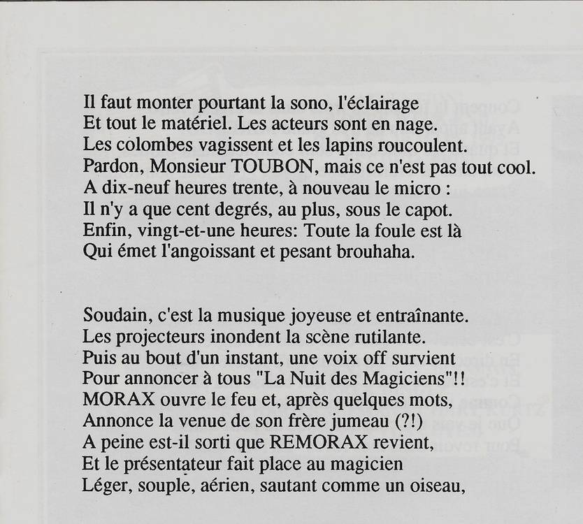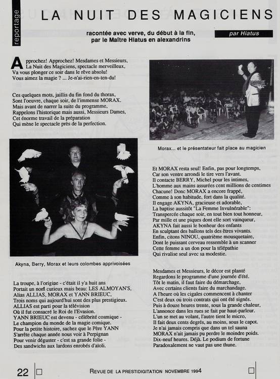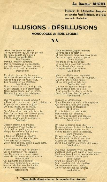 René Laquier alias Alquier est toujours magicien et affiche une date de naissance éloquente 14 janvier 1915 soit 98 ans Il avait un texte remarquable pour la cravate en soie à pois !!!!!!!! Il a écrit la célèbre chanson "A bicyclette" chantée par Bourvil .... Il a aussi été dans La Brigade du Tigre...... et a vu un acteur jouer son rôle dans les feuilletons télé. René est toulousain mais vit maintenant en Banlieue parisienne.1 point
