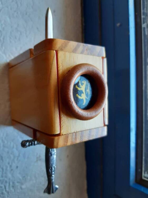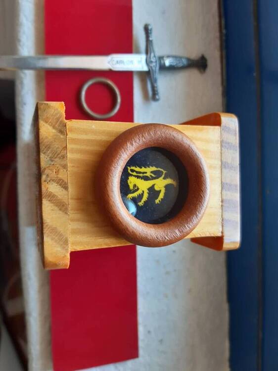 Kennad Box (Mystery box) médiévale (Boite/épée en métal / anneau) 25 euros fdpi france. Notice français Un anneau en laiton est posé sur le sol d'une petite boîte en bois. Les portes avant et arrière de la boîte sont fermées. Une mini épée magique est placée dans les trous existant sur les parois latérales de la boîte, les extrémités de l'épée dépassant à l'extérieur de la boîte. Le magicien fait des passes magiques autour de la boîte, puis sort l'épée et là arrive la surprise. L'anneau se retrouve coincé sur la baguette ! Les deux portes de la boîte sont ouvertes, montrant ainsi clairement qu'il n'y a pas de bague en double. La bague, la boîte, l'épée magique peuvent toutes être vérifiées par les spectateurs de près. La boîte mesure 5 cm x 4,5 cm x 7 cm environ.1 point