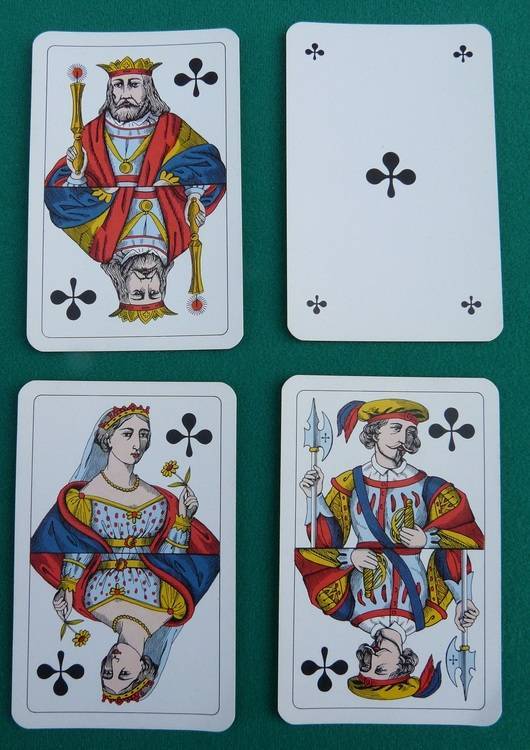 Lot de 36 cartes livrées comme telles à l’époque (les valeurs 2 à 5 de chaque famille manquent)