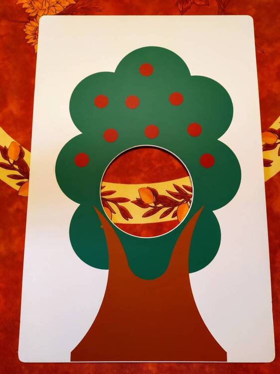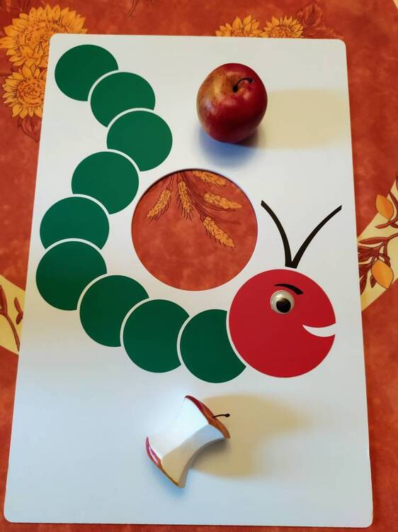 La chenille vorace Jocelyne, avec la pupille de son œil mobile (photo 4), est représentée d’un côté d’une grande et solide plaque de plastique (photo 2). De l’autre côté, un grand pommier (photo 3).