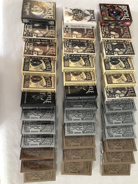 Bonjour, Je vends un lot de 12 jeux Bicycles : - 2 New Fan Back (bleu/rouge) - 1 Guardian - 1 Starlight - 2 Civil War (Rouge/Bleu) - 2 130th Anniversary (Bleu/Rouge) - 1 Bicycle Rider Back Argent - 2 Bee (Rouge/Bleu) - 1 Bicycle fireworks 100 euros le lot Joyeux noel ! -