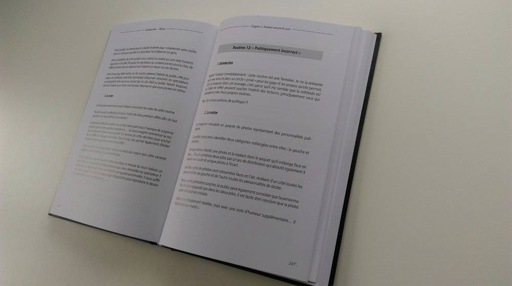 Ce livre contient plus de 30 routines pratiques et ayant un fort impact sur les spectateurs. La plupart pourront être ajoutées immédiatement à votre répertoire. Mais Guillaume Botta va bien au-delà : il vous dévoile sa vision de la magie et du mentalisme. Au fil des pages, vous apprendrez ainsi à créer un véritable moment d’émotions et de partage avec vos spectateurs. Pour Guillaume, le magicien est un concepteur et un interprète qui a entre les mains une boîte à outils constituée de techniques, de structures, d’accessoires, d’éléments de mise en scène. Dans chaque routine, l’auteur vous apprend à jouer avec tous ces outils pour obtenir un ensemble cohérent et harmonieux qui vous ouvrira la porte de votre chemin magique. La lecture de cet ouvrage vous permettra de retrouver l’essence de chaque effet pour mieux provoquer le sentiment de l’impossible. Ce faisant, Guillaume vous livre toutes les clefs pour libérer le public de ses certitudes et en apporter une nouvelle : la magie existe en chacun de nous. Les avis d'Alexis: Livre en excellent etat comme neuf. Prix: 40€ FDPI