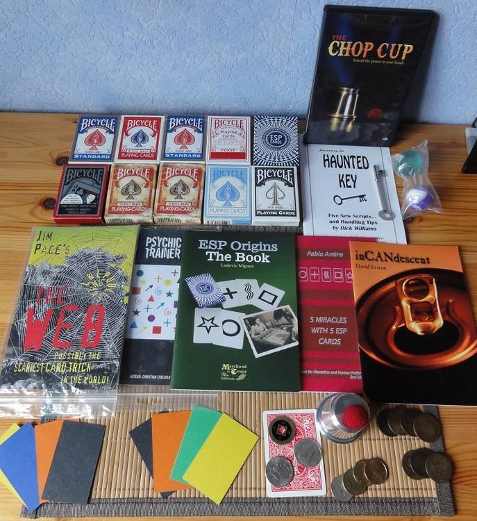 Livres Dick Williams : Presenting the haunted key Ludovic Mignon : ESP Origins - the book Pablo Amira : 5 miracles with 5 ESP cards David Ethan : inCandescent (exemplaire 57/100) Tours Haunted Key Pack chop cup : 1 chop cup + 2 muscades aimantées + 2 charges finales + DVD Feel a Color (x2) Christian Chelman : Psychic Trainer Jim Pace : The web (notice, cartes, 2 araignées, 2 papillons) Lethal Tender (demi-dollar, pièce chinoise, gimmick en demi-dollar, carte spéciale) Une dizaine de pièces diverses, notamment de vieilles pièces format demi dollar, datant de 1860 à 1920, pour des routines avec ambiance d'époque Cartes (les jeux de cartes ont tous été ouverts, mais mise à part le reverse blue, ils n'ont quasimenent pas été utilisés et sont en excellent état). Bicycle Tragic Royalty Bicycle 1800 rouge (x2) Bicycle Reverse Blue Bicycle Split Spades (jeu marqué) ESP Cards (pour aller avec le livre) Jeu "semi biseauté" rouge Cartes spéciales et diverses (40 double dos rouge, 15 double faces, une douzaine de 6 de trèfle, une douzaine de dames de pique, des cartes publicitaires...) En prime, je fourni des routines sur papiers pour les cartes ESP et pour le jeu marqué, ainsi que d'autres notices qui accompagnent certains tours. Je ne vends que tout le lot, je ne ferai pas de détail. 65€ FDPI -