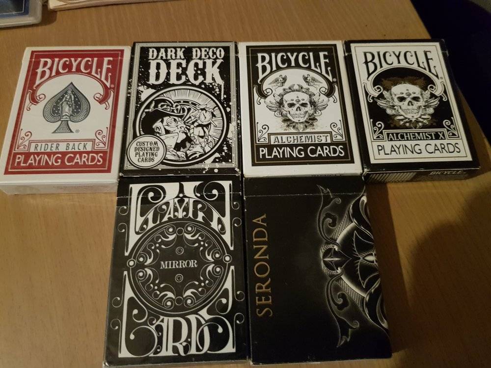 Bonjour à tous je met en vente quelques jeux de cartes de ma collection, ils sont tous ouvert mais en très bonne état juste 2 ou 3 passes de réalisé avec chacuns Le lot est le suivant: .1 Smoke and Mirrors de Dan&Dave .1 Seronda noir .1 Dark Déco Deck .1 Bicycle rouge titanium .1 Bicycle alchemist(noir) .1 Bicycle alchemist x(blanc) Je cède le tout à 30 euros plus les frais d'envoi, photos supplémentaires si besoin. Merci de me contacter si intéressé. A bientôt sur VM!