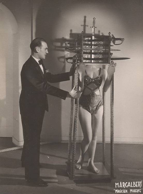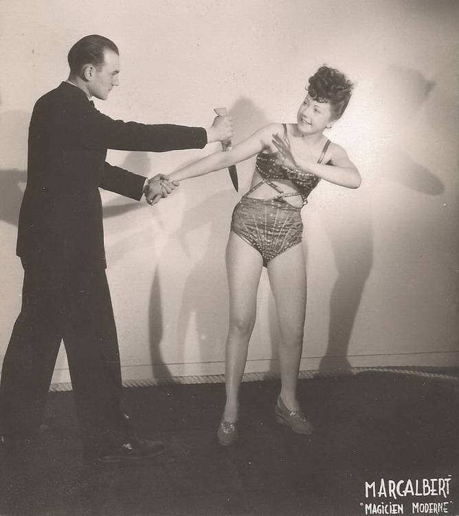 Je peux me tromper, mais je crois me souvenir que le père de Marcalbert avait aussi été Trésorier de l'A.F.A.P. 2 photos de Marcalbert la tête aux sabres et le couteau au bras. sauf erreur de ma part, Didier me corrigera si nécessaire... sa partenaire sur ces photos doit être Annie BERT la femme de Guy BERT marchand de magie -