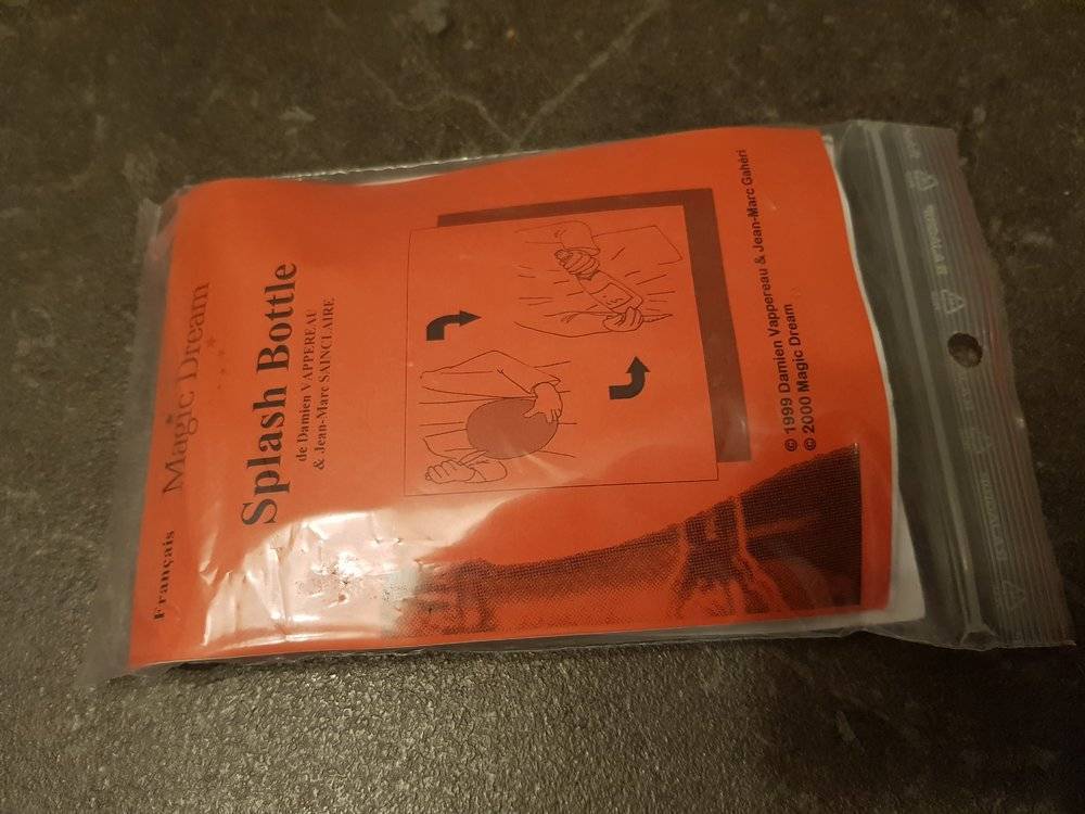 Splash Bottle' ,des magiciens français Damien Vappereau et Jean-Mark Sainclaire, est idéal pour terminer un numéro de close-up, salon ou scène. Le magicien présente un ballon, le gonfle. Le ballon est vu sous tous ses angles. Le magicien sort un couteau, éclate le ballon. Une véritable bouteille de champagne apparaît à la place du ballon. 'Splash bottle' peut être utilisé à tout moment de votre numéro. Le livret qui accompagne splash bottle fourmille d’astuces et donne d’autres applications. Neuf , jamais utilisé pour cause de doublon : 15€ fdpi