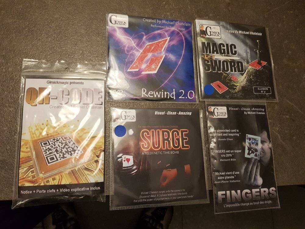 L'ensemble des tours ci-dessous sont neuf et n'ont jamais été utilisé !! REWIND 2.0: 20€ FDPI 2 gimmicks ( 1 bleu et 1 rouge ) Une carte est sélectionnée par un spectateur. Vous la pliez en quatre et demandez à ce dernier d’en signer la face. Puis la carte est déchirée, d’abord en deux puis en quatre. Les morceaux déchirés de la carte sont bien montrés séparément : vous en coincez deux entre vos lèvres et tenez les deux autres, chacun, dans une main, du bout des doigts. Les deux morceaux tenus en mains sont rapprochés. Dès qu’ils se touchent ils se ressoudent pour ne plus former qu’un seul morceau. Puis vous récupérez l’un des morceaux tenu entre vos lèvres et le rapprochez du précédent. A la seconde ils se ressoudent aussi. Puis le gros morceau (à présent composé de 3 morceaux) est rapproché de celui que vous tenez encore entre vos lèvres. A peine se touchent-ils qu’ils se ressoudent ! Et vous avez à présent une carte entière en mains ! MAGIC SWORD : 15€ FDPI Sortez de votre poche votre jeu de cartes. Sortez les 52 cartes de leur étui et montrez les sans aucunes restrictions à votre entourage, 52 cartes, toutes différentes, rien de plus. Expliquez à vos spectateurs que chacun d’entre nous à un petit faible pour une carte, certain vont préférer les cartes de valeur cœur pour le coté AMOUR ou d’autres pour les trèfles pour le coté CHANCE, etc... Expliquez que votre carte préférée est sans aucun doute le roi de pique ! Sortez le roi de pique de votre jeu et montrez le à la ronde tout en expliquant que le roi de pique peut également réaliser une curieuse prouesse magique. Montrez bien la carte, invitez même vos spectateurs à toucher la carte sur toute sa surface, rien, absolument rien d’anormal, c’est une carte, un roi, avec deux épées et rien de plus ! Posez votre carte favorite sur la table face visible et invitez un spectateur à choisir une carte dans le reste de votre jeu. Pour mieux comprendre, nous imaginerons que la carte ainsi sélectionnée est : 10 de cœur. La carte du spectateur est perdue dans le jeu, étalez le aussitôt entre vos mains, la carte choisie a complétement disparu ! Reprenez entre pouce et index votre carte fétiche, montrez la une dernière fois recto-verso. Votre seconde main quand à elle soulève de quelques centimètres la moitié du jeu. Passez rapidement votre roi de pique dans cette brèche, à peine est-il entré, qu’il ressort déjà mais à la surprise générale, un de ses bras a changé ! Celui-ci tient toujours fièrement son épée mais celle-ci est en dehors de la carte, comme si le dessin avait pris vie en une fraction de seconde. SURGE : 15€ FDPI Phase 1 : Sortez votre jeu de cartes et invitez un spectateur à choisir une carte, librement ! Prenez la carte choisie et pliée la en 2 dans le sens de la hauteur et posée la debout sur la table. Frottez vos mains, pour les charger de magnétisme, et approchez les de la carte du spectateur, aussitôt celle-ci tome comme poussée par une énérgie invisible. Bien entendu, vos spectateurs ne sont pas dupes et penseront immédiatement que vous avez soufflé pour la faire tomber... Phase 2 : Invitez votre spectateur a choisir une carte, sans le moindre forçage, puis prenez votre étui de cartes et posez le aussi sur la table. Placez visiblement la carte choisie du spectateur contre l'étui, même en souffalnt il est alors impossible de faire tomber la carte, cela est evident ! Concentrez vous à nouveau et là, la carte tombera violemment et brusquement sur la table poussée par une force invisible ! Phase 3 : Votre spectateur va maintenant participer à une incroyable expérience ! Une dernière carte est choisie, elle peut être signée cela n'a pas d'importance. Déchirez lentement et visiblement un des quatres coins de cette carte, sans aucun change ou mouvement suspect, posez ce coin sur la main de votre spectateur. Concentrez vous sur ce coin de carte et soudainement l'impossible ce passe, le coin posé sur le dos de la main du spectateur saute et tombe sur la table ! FINGERS : 15€ FDPI Sortez votre jeu de cartes et invitez un spectateur à en choisir une LIBREMENT. Le spectateur peut changer de carte autant de fois qu'il le souhaite puisque n'intervient aucun forçage ! Son choix est 100% libre ! Admettons que son choix se porte sur L'AS DE COEUR. La carte, une fois signée, est de nouveau perdue dans le jeu. Mélangez ou coupez celui-ci à plusieurs reprises si vous le souhaitez. Une passe magique... et une carte, une seule, se retourne mystérieusement face en l'air dans votre jeu face en bas ! Étalez le jeu entre vos mains pour révéler la carte face en l'air... Malheureusement, ce n'est pas la bonne carte et le spectateur ne manquera pas de vous le faire remarquer ! La carte qui s'est retournée face en l'air est LE ROI DE PIQUE ! Aucune importance, vous êtes magicien ! Prenez le roi de pique du bout des doigts, entre pouce et index, tenez le bien visible, devant le spectateur, mise à part le roi de pique, vos mains sont absolument vides ! La main droite qui tient le roi de pique ne bouge plus tandis que la main gauche passe une fraction de seconde devant le roi de pique. QR CODE : 15€ FDPI Demandez à vos spectateurs s'ils connaissent les QR-CODES ? Sortez alors de votre poche un porte clefs et montrez le à la ronde en attirant l'attention justement sur le QR-CODE qui est imprimé dessus. Expliquez qu'il s'agit d'une prédiction ! À l'aide du smart phone de votre spectateur ou du votre, vous flashez (scannez) le QR-CODE ! Un bip se fait entendre que déjà une carte apparaît sur l'écran du téléphone, le CINQ DE COEUR par exemple. Dans quelques secondes votre spectateur devra choisir une carte et la posera face en bas sur la table... sans la regarder ! Avouez que si le spectateur choisit le cinq de cœur votre prédiction sera correcte à 100 % et se sera alors parfait ! Sortez un jeu de cartes ordina