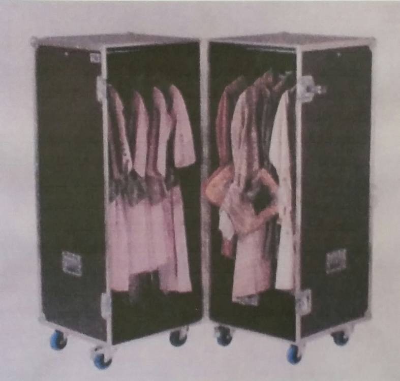 Article totalement neuf. Flight Case pour professionnels du spectacle, contient 24 costumes. Version Classique, modèle Opéra. Dimensions hors tout : Hauteur 1,60m x Largeur 1,20m x Profondeur 60cm. Configuration type armoire. Ouverture sur charnières en 2 parties égales. Panneau de bouleau filmé 9mm. 2 Fermoirs encastrés à pavillon cadenassables. 10 Poignées encastrées à ressort. 8 Roulettes D100 dont 4 à blocage. Grilles de ventilation. Aménagement : 2 tringles largeur 57cm, hauteur 1,40m et système de blocage des cintres. Poids : 76 kg. Couleur Marron foncé. Prix : 300 Euros