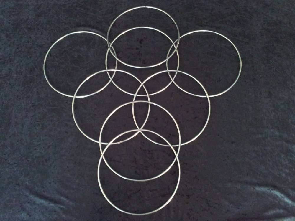 8 anneaux chinois en inox, totalement neufs (avec housse de rangement). 1 chaine de 3 + 1 chaine de 2 + 2 singles + 1 clé. Diamètre : 25 cm / Épaisseur 6 mm. Matériel d’excellente qualité, avec une très belle sonorité, fait sur mesure par un professionnel du métal. Grand classique de la magie qui produit toujours autant d’effet. Prix : 200 Euros