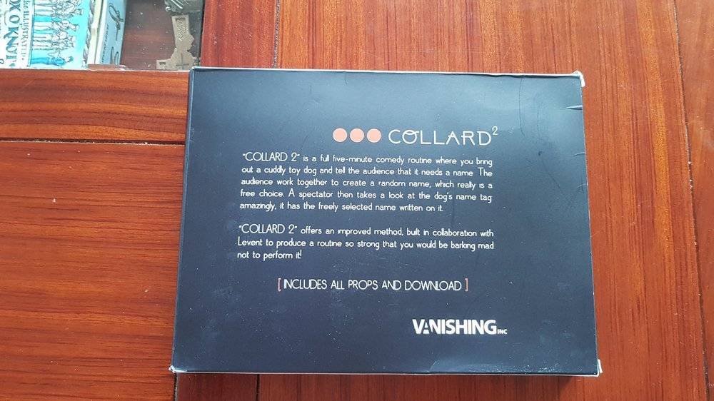 Collard 2 de John Archer est une routine comique complète de cinq minutes. L’effet ? Vous sortez un chien en peluche et expliquez au public qu’il a besoin d’un nom. L’assistance travaille ensemble pour créer un nom aléatoire (ce qui est vraiment un choix libre). Un spectateur jette ensuite un coup d’œil à la plaque d’identification du chien sur son collier … Étonnamment, le nom librement choisi y est inscrit ! Collard 2 offre une méthode améliorée. Tous les gadgets sont inclus, sauf…l’animal en peluche qui n’est pas fourni. NEUF JAMAIS SERVI J'ai rajouté un stylo et un collier pour la peluche prix 47€ FPC