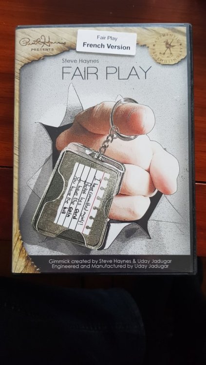 "Fair Play" est un ingénieux gimmick qui permet de prédire la localisation de trois objets empruntés ! Accroché à votre porte-clefs se trouve un petit cadre en plastique. À l’intérieur de celui-ci se trouve un morceau de papier comportant un message secret. Un spectateur tient le porte-clefs contenant le message dans ses mains. Vous empruntez ensuite n’importe quelle carte de visite, n’importe quelle pièce et n’importe quel billet. Le spectateur place librement l’un de ces trois objets dans sa poche. Il n’y a aucun forçage. Puis, il vous donne sans équivoque l’un de deux objets restants. Il garde le troisième objet dans sa main. La carte de visite, la pièce, le billet, il décide de l’endroit où placer chacun des objets ! Aucun forçage. Ses choix sont libres. Il peut changer d’avis autant qu’il le souhaite ! La prédiction qui est entre ses mains depuis le départ est révélée, elle est parfaitement exacte et la prédiction peut être donnée à un examen minutieux ! Le spectateur fait tous les choix : - Aucun forçage. - Il peut changer d’avis autant qu’il le souhaite. - Tous les choix sont parfaitement libres. Encore plus honnête : - Le spectateur tient la prédiction dès le début. - Aucun change ou manipulation. - Rien à cacher ou à retirer. - Pas d’électronique. - Se préparer en quelques secondes. - Le spectateur peut complètement examiner la prédiction. - Les trois objets sont empruntés. - Le gimmick Fair Play est autonome et automatique. - Vous n’aurez qu’à le mettre sur votre porte-clefs et serez toujours prêt à le présenter ! - Le gimmick avec la prédiction finale est en français. Quasiment neuf, en parfait état, fourni avec le gimmick et le CD-ROM prix : 35€