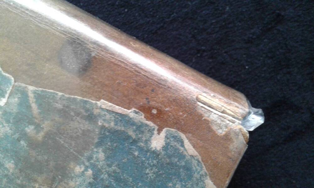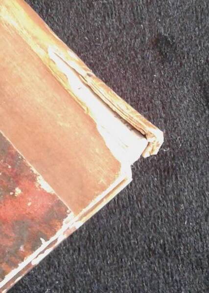 “coiffe inférieure cassé sur 2 cm, coiffe supérieur arasée, trace d'usure sur le premier et le quatrième plat, coins émoussée, trace de salissure sur la premier page, trace de salissure marron sur le bas de la première planche à dessin.”