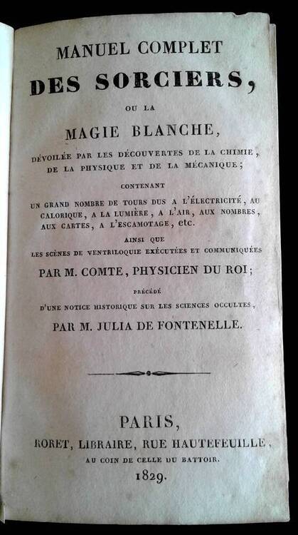 Vend : Manuel complet des Sorciers ou la Magie blanche par Julia de Fontenelle - édition original 1829 - éditeur Roret - 220 euros fdpi
