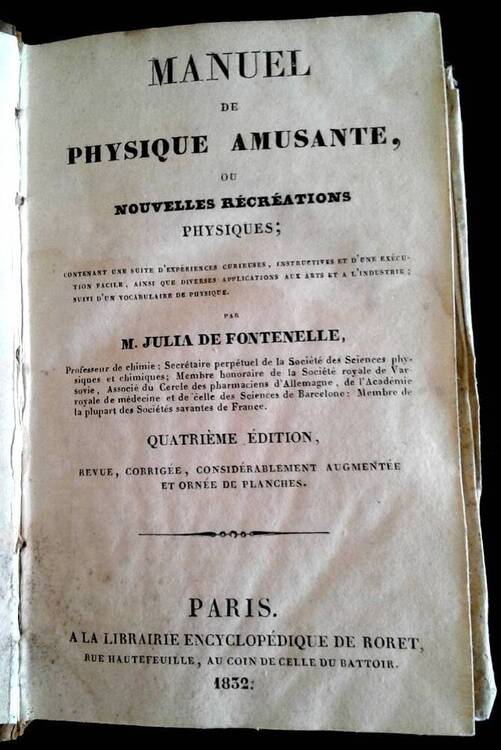 Manuel de physique amusante ou nouvelles récréations physique de Julia de Fontenelle - 180 euros fdpi