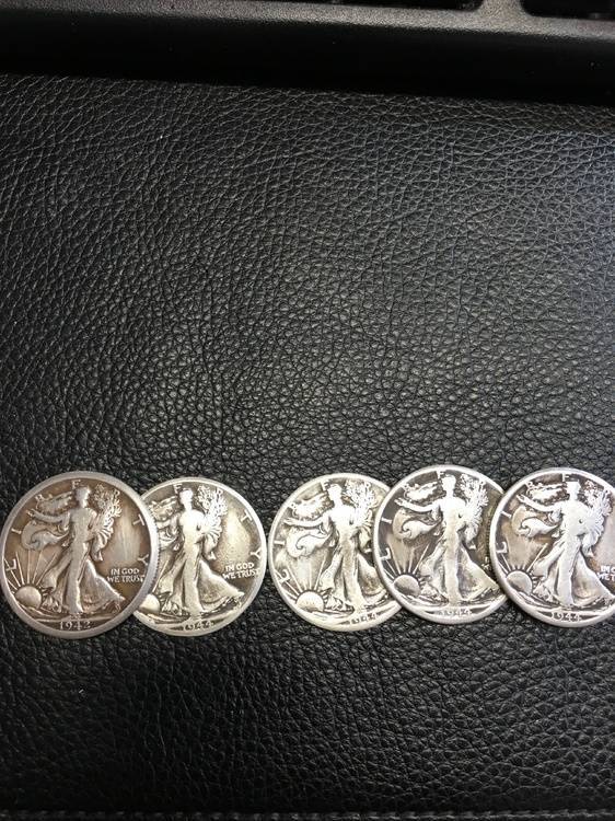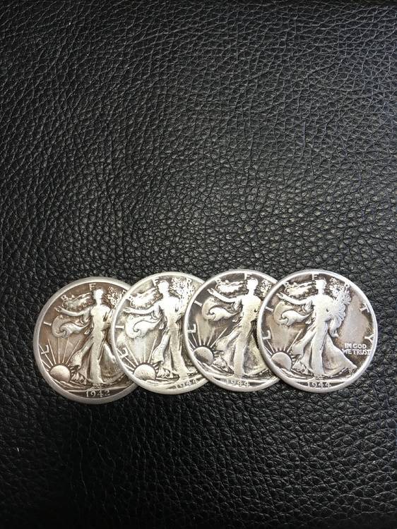 Vends set de 4 pièces walking Liberty argent année 1944 + une coquille expansée walking Liberty 1942 . Set softé et d'aspect vieilli . Glisse très bien tout en gardant l'aspect d'origine de la pièce