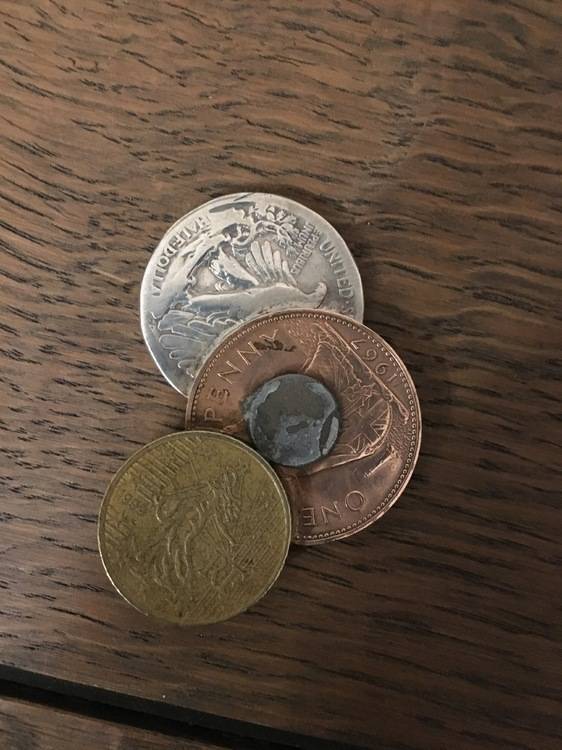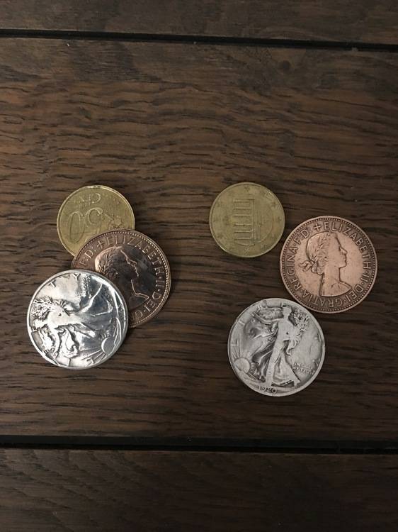 Vends gimmick pour 3 fly composé de 3 Pieces collées : un walking Liberty argent, un penny et une pièce 50 centimes et les trois Pieces identiques non collées voir photo