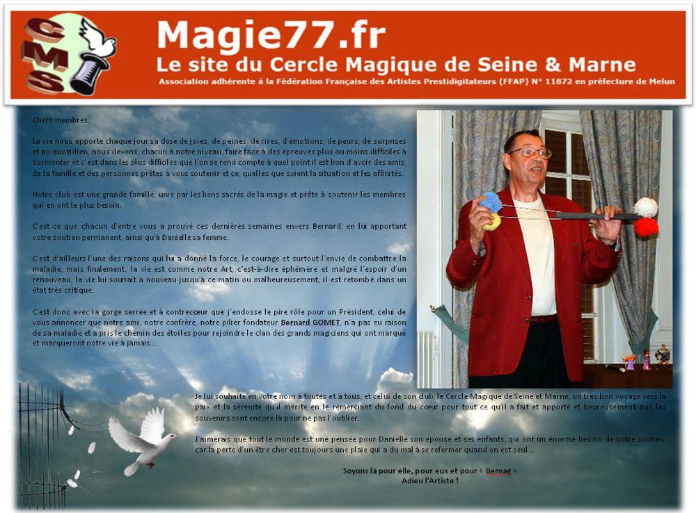 En ce jour du 08 mars 2012 et à l'occasion du 30ème anniversaire du Cercle Magique de Seine et Marne, le club est en deuil et voudrait par l'intermédiaire de l'image ci-dessous, rendre un hommage public à l'un des membres fondateur qui nous a quitté ce matin, emporté par la maladie... Bon voyage Bernard GOMET et merci pour tout !!! [img:center]http://magicalliance.free.fr/CMS/Condoléances_CMS_Bernard.jpg[/img] -