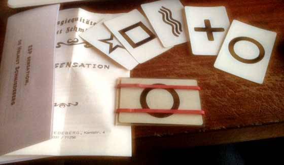 Vous avez 5 cartes ESP, et montrez-les à votre public. Demandez à un spectateur de mélanger les cinq cartes, et de les poser faces cachées sur votre table. Votre spectateur choisit une carte. Les quatre autres cartes sont rassemblées, et laissées de côté. Vous posez alors un cendrier, ou un objet similaire, sur la carte choisie. Le spectateur n’a pas encore connaissance du symbole ESP qu’il a choisi, et apparemment vous non plus.