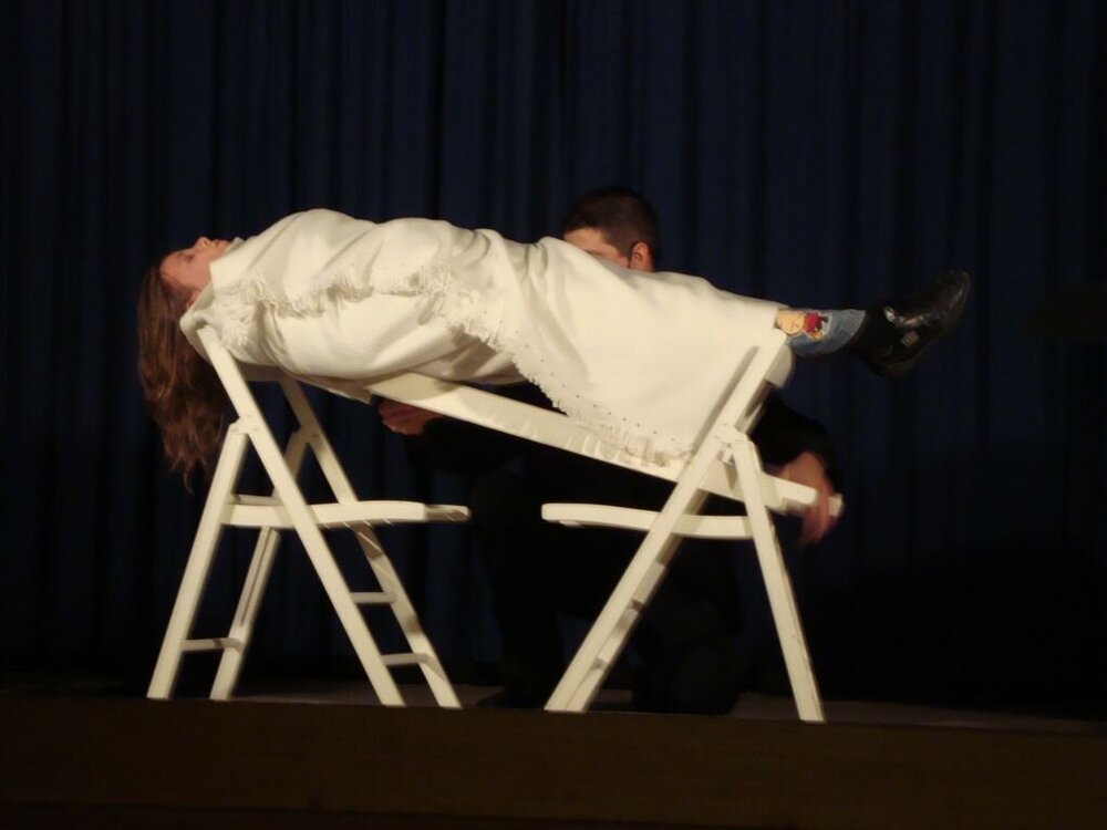 Deux chaises sont installées face à face. Une planche recouverte d'un tissus repose sur les deux dossiers. Une personne est invitée à se coucher sur la planche, enveloppé dans la couverture. Après quelques gestes magiques, vous enlevez la planche, et, à la grande surprise du public, vous enlevez également la chaise supportant les pieds. Votre spectateur est ainsi maintenu en catalepsie, seule la nuque repose sur le dossier de l'unique chaise. Peut se présenter avec un membre du public, ce qui en augmente l'impact. Prix : 150€ Frais de livraison : 50€ A retirer sur place de préférence