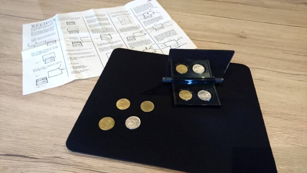 Un jeu de miroir incroyable où les reflets de pièces de notre ancienne monnaie se matérialisent, s'inversent et finissent par se dédoubler. Le miroir comporte des petits défauts mais qui n'empêche pas de faire la routine, on pourra parler d'un miroir ancien aux pouvoirs magique ou bien le restaurer en collant par dessus un film miroir neuf. Le mécanisme fonctionne parfaitement. Livré avec 2 pièces de 1 franc et 4 pièces de 20 centimes Notice fournie 30€ FDPI