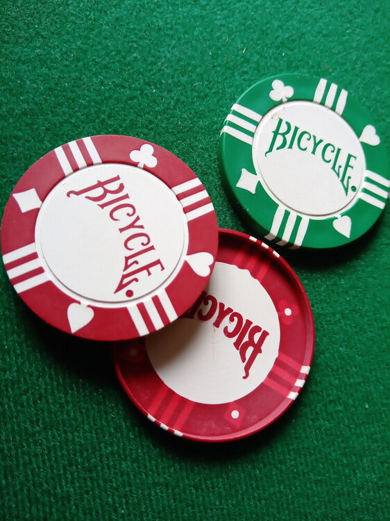 Bonjour, Vends un ensemble jetons rouge avec une coquille rouge plus un jeton vert de marque Bicycle 15 Euros Fdpi