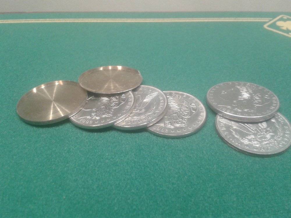 Voici un lot neuf de replica Morgan qui comprend: 3 Pièces normal,1 Flipper Coin, 1 coquille+1 coquille glissante. L'ensemble 60 euros fdp.