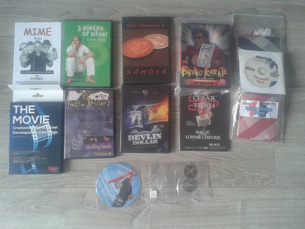 Bonjour je vend un lot de tours et dvd neuf et d'occasion. Faite votre offre(la valeur total s'élève a environ 600 Euros) Je vous mets le prix d'achat et un lien vidéo démo pour chaque article: Xtc coin(120 Euros) https://www.youtube.com/watch?v=n7P4H7k-XeM https://www.youtube.com/watch?v=0OQfYqHNTO8 Trailer Svargo's Mime Teaching DVD(30 Euros) https://www.youtube.com/watch?v=KijzL-cNiBI The Movie by Mario Daniel and Gee Magic(49 Euros) https://www.youtube.com/watch?v=zIGhOKl0Bkg 3 pieces of silver by Rune Klan(30 Euros) https://www.youtube.com/watch?v=FVCh4UXThpQ Strolling Hands Volume 2 by Justin Miller(30 Euros) https://www.youtube.com/watch?v=aCLmQbHWjqM samoya Rob Thompson(30 Euros) https://www.youtube.com/watch?v=37x8T3c-tpU Devlin Dollar Criss Angel(25 Euros) https://www.youtube.com/watch?v=9T6Q-PnPPZw Bravo Karaté(70 Euros) https://www.youtube.com/watch?v=tBWvKiokDyM Clean Thru Clear Thru by Lonnie Chevrie and Kozmo Magic DVD(15Euros) https://www.youtube.com/watch?v=G99jyqTAK4s Colors Change glove Magic Artist(80 Euros) https://www.youtube.com/watch?v=2VhNiU9tByg Double silk production & Ultimate card fan production(120 Euros) https://www.youtube.com/watch?v=gvx64qtVZhQ