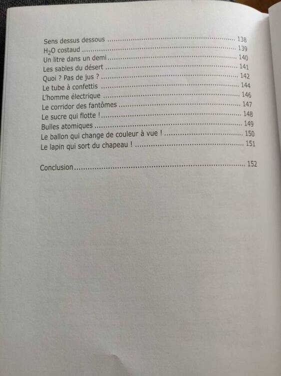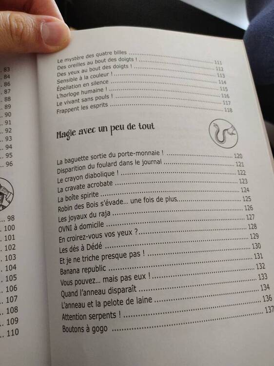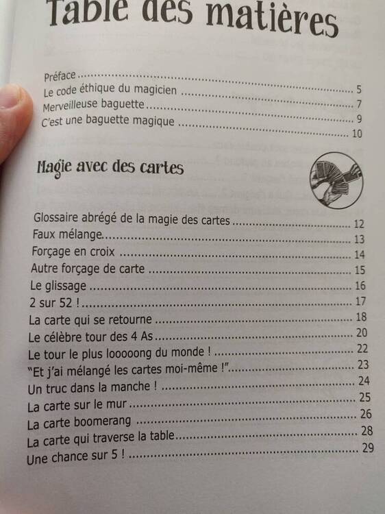 Salut ! Je t'ai joins la table des matières en photo afin que tu puisses te faire une idée du type de tour. Il y a des tours automatiques, des tours très simple et même des tours plus complexe. La première fois que j'ai vu ce livre dans une librairie je me suis dis "Ah ça sent le livre qui donne envie aux enfants mais dont le niveau des tours à l'intérieur est décevant". Et bien pas du tout, ne serait ce que l'apparition d'un lapin dans un chapeau, la lévitation de table dans une séance de spiritisme, les bases en pièce et corde, la fabrication d'une boite à apparition. Ainsi que des démonstrations qui ne sont pas des tours de magie mais peuvent amener bien plus loin (comment déchirer un paquet de carte complet d'un seul coup). Il y a un timbre collé au plafond d'une salle du Magic Castle, avec ce livre vous saurez qui l'y a mis et comment ! Je regarde le livre au moment même où je rédige ce message et j'en reste étonné. A chaque fois que j'ouvre une page de ce livre je me dis, c'est dingue qu'un livre à ce prix, si facile d'accès donne autant de trucs professionnels. J'espère que tu y trouveras tout ce que j'ai pu y trouver
