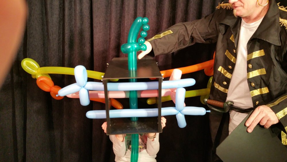 BONNE AFFAIRE : 165€ FDPI et 6 sacs de ballons + pompe qualatex Vous connaissez la "Tête aux Sabres" et bien voici maintenant pour les spectacles d'enfants : la "Tête aux Ballons" ! Vous coiffez la tête d’un jeune assistant d'un caisson dont les panneaux avant et arrière ont été retirés. Une fois ceux-ci remis en place, sculptez 8 ballons en "Epées" et enfoncez-les à travers le caisson !!! Retirez la façade avant, la tête de l'enfant a disparu... Le public ne voit à l’intérieur que l’entrecroisement des "épées" !!! Refermez le caisson, ôtez les "épées" et dégagez votre assistant qui a toujours bien la tête sur les épaules. - Cette illusion peut se faire complètement entouré. - Vous pouvez faire traverser le caisson par 8 ou 10 ballons selon que vous souhaitez les faire traverser de part en part ou non. - Maniement sans risque, pas de tirette sur le dessus du caisson. - Entièrement démontable. - Fabrication PVC, livré sans décoration, vous permettant à chacun de décorer le caisson selon vos goûts - Dimensions du caisson : 41 x 27 x 30 cm environ