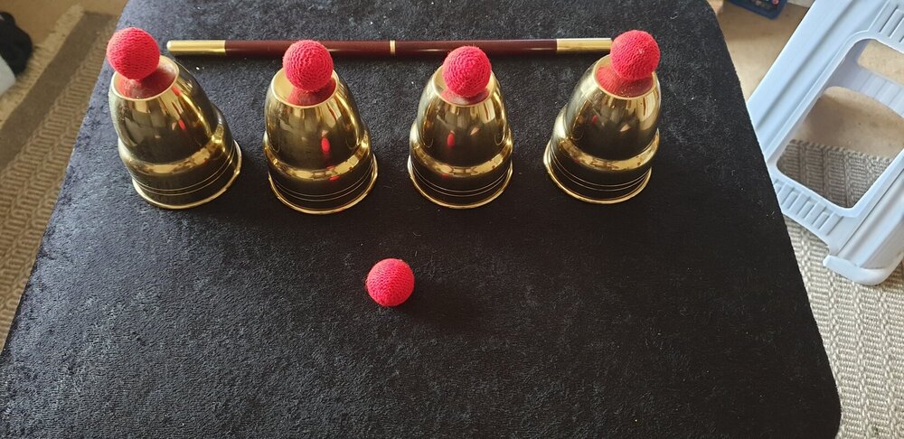 .3 gobelets en laiton massif + 1 chop cup .2 oeufs rebondissants + 3 "yeux" clignotants (1 des 3 ne clignote plus) .5 balles crochetées dont 1 magnétique .1 baguette bois/laiton (qui peut être dévissée en 2 parties) 140€ fdi