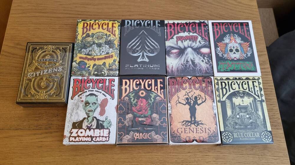 Vends lot de 9 jeux de cartes poker : - Theory 11 Citizen - 3 Bicycle Zombies - Bicycle Platinium - Bicycle Tatoo - Bicycle Magic - Bicycle Genesis - Bicycle Blue Collar numéroté 1622 / 4000 Tous les jeux sont ouverts proprement mais les cartes n'ont pas servi (collection). Somme prix du neuf : 100 € hors frais de port. Lot vendu à 90 € fdpi