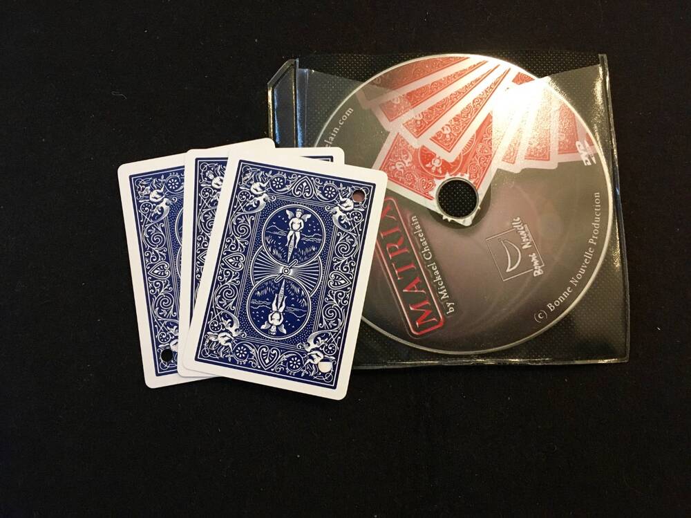 "Un incroyable voyage de cartes ! Vous présentez deux paquets de quatre cartes, l'un rouge et l'autre bleu. Vous faites choisir une carte dans le paquet bleu. Cette carte va disparaître et réapparaître dans le paquet de cartes rouges ! Il n'y a aucun contact entre les deux paquets. Il n'y a ni empalmage ni transfert à réaliser. Cet effet simple, direct est tout bonnement miraculeux ! " cartes bicycle 12 euros FDI